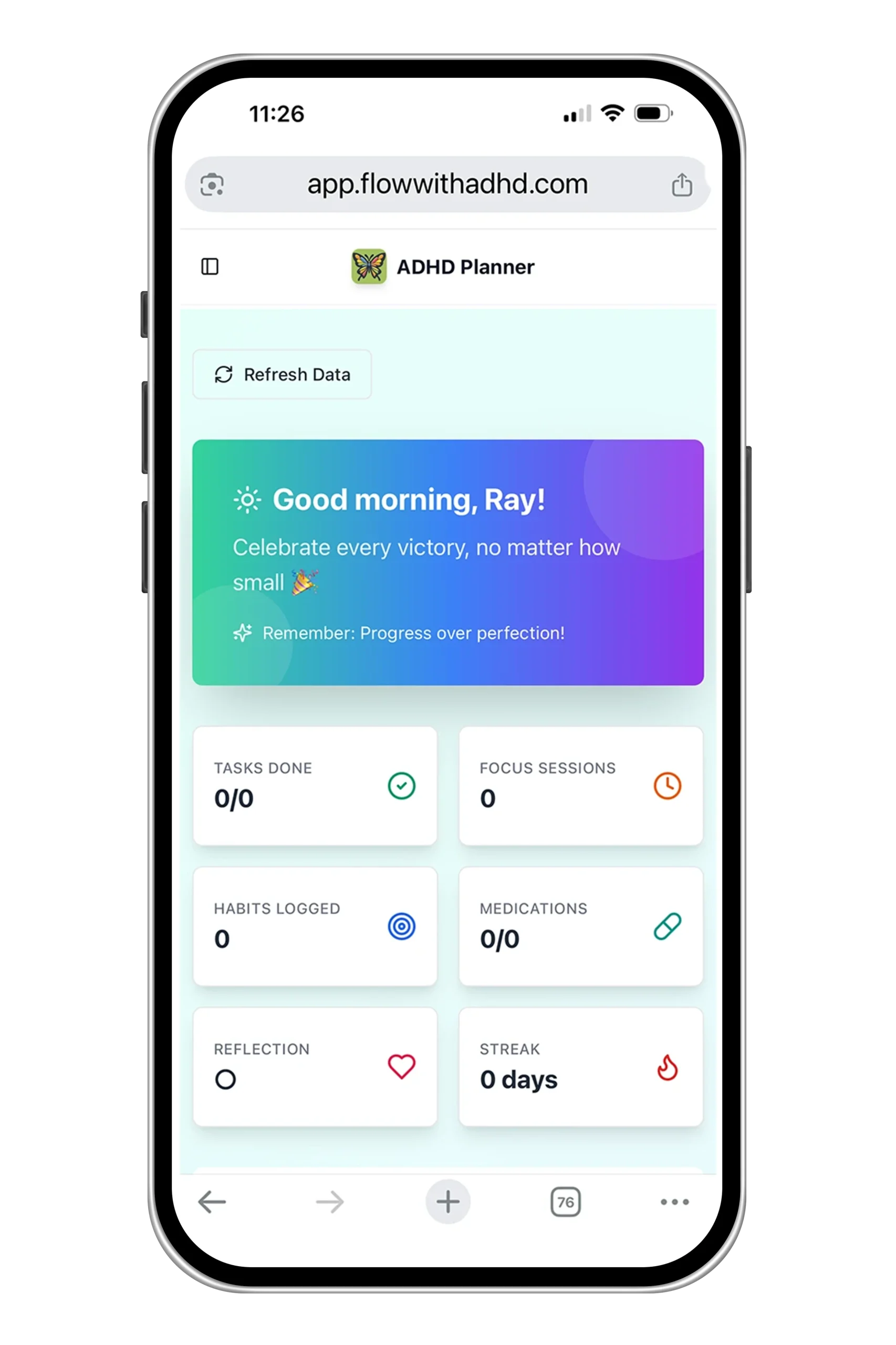 Take control of your day with the #1 ADHD Planner WEB App – built specifically FOR DESKTOP & MOBILE DEVICES (FOR MOBILE ONLY VISIT OUR iOS APP PAGE) to support focus, organization, and productivity for ADHD minds. With a modern, colourful, and ADHD-friendly design, this planner makes managing tasks feel motivating instead of overwhelming.